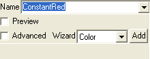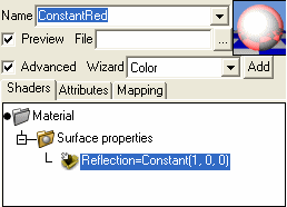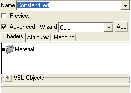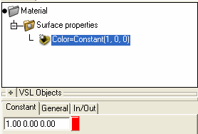 6. The new Constant node is again selected, and the lower part of the window shows you its properties. The default color value is black. Click the small sample color square and change the color to red. 7. Check the Preview button to update the icon in the material select tab and to view the effect of the material. Your first VSL material is now ready. |