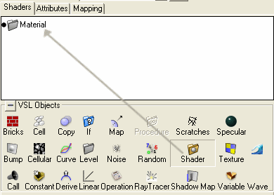 5. Our goal was to create a material, which simply turns surfaces red. This means that we want to define the surface properties of objects. Drag the Shader icon from the Available Objects and drop it over the 'Material' node appearing at the top part of the window. Note how the mouse pointer changes to indicate when dropping is allowed. This creates a new node to the VSL tree. The new node has the name 'Surface properties' and is automatically selected, as the highlighting of the name indicates. Look at the lower part of the VSL editor. It always shows the properties of the selected VSL object. The current selected object, 'Shader', has only one property, 'Type', which is by default 'Surface properties'. Click the right side of the 'Type' gadget to open the whole list of available types; it includes names such as 'Light properties', 'Volume illumination', and so on. |