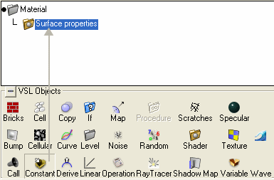 Many of the shader types are easy to understand from the short but descriptive name. If you want to make an object red, you need a 'Surface properties' shader, because 'red color ' is a property of the surface (red paint, etc.). If you want to define how fog reacts in light, you need a 'Volume illumination' shader. Makes sense, doesn't it? The default type 'Surface properties' is exactly what we need, so do not change it, just close the type list by clicking the right side of the gadget again. Surface properties is the most frequently used shader, and that is why it is the default type for all newly created shaders. 5. Drag & drop the Constant icon from the Available Objects box inside the Surface properties node. Again, a new node is inserted into the VSL tree. |