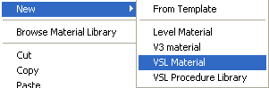 In this example we will create a material which turns the surface red. 1. First we need a new VSL material. To create one, switch to the Materials tab in the select window, open the pop-up menu by clicking the right mouse button, and pick New/VSL material from the list. |