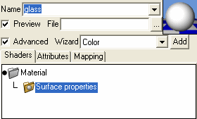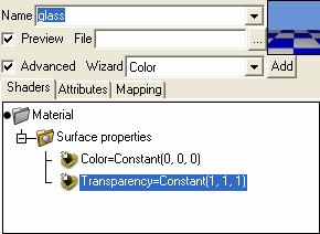 Open the property window unless already opened. The newly created material is automatically selected. The Advanced and Preview options should also be set from the previous example; if not, activate them. The first step is the same as in ConstantRed: drop a Shader from available VSL objects into the root level material node. Most glass properties can be defined in Surface properties, and therefore we do not have to change the default type of the shader. |