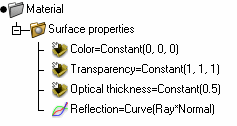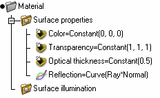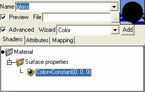 Drop a Constant object from the available objects into Surface properties. The constant object is inserted, assigning the constant black value to the (diffuse) color channel. Consequently, the preview turns black. This is what we want, because the surface of glass is so smooth that it does not scatter light randomly around but lets it through and reflects it in certain exact angles. Keep in mind that random scattering is the source of matte-like diffuse shading. |