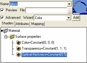 Drop a new constant object to surface properties and change the output to Surface:Optical thickness. The default thickness is zero - the thickness of empty space. Change the value of constant object to 0.5 using the gadget at the bottom of the property window. Note that optical thickness is defined by a single value, whereas color has three components: red, green and blue. The constant object automatically changes its value gadget to match the sub channel dimension of the output channel.