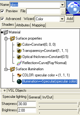 Select New\VSL material from the select window's popup menu and rename the created blank material as Glass.