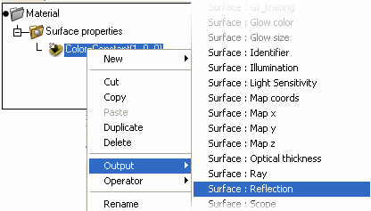 Using the previous material, make sure that the Constant VSL object in the material hierarchy is selected (its name is highlighted). Move the mouse pointer over the area, which shows the VSL structure of the material, and open the popup menu using the right mouse button. Open the Output sub menu. It includes a long list of items: Surface:Alpha, Surface:Color, and so on. Select Surface:Reflection from the list. The long menu list shows the properties, which describe the type of the surface: the amount of diffuse color, reflection, transparency, etc. Such properties are called Channels in Realsoft 3D. You can control the appearance of a material by writing desired values to suitable channels, just like we did above (first diffuse color and now mirror reflection). |