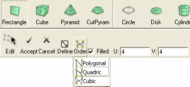 Set Order to cubic, make sure Filled is checked and specify the control point count 4x4 through the U and V fields. 2. Then enter two points through a view window to define a geometry for the rectangle. |