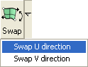 Sometimes you have to swap the direction of a mesh. For example, it may be necessary to invert the direction of a mesh to get it concatenated properly to another mesh. The Swap tool swaps the direction in both u- and v-directions. To swap the direction in one direction only, select the appropriate pop-up menu item from the tool button. |