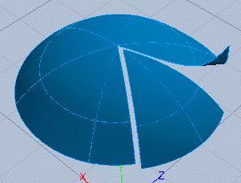 So, what happens if we break the mesh in its V direction? In that direction the surface is open: All V directed curves have end points at the poles of the sphere. 4. Select the north-pole mesh and activate Break by V Directed Curve. Then drag the mouse over the hemisphere to find a desired position for the break curve. When found, release the mouse. As you can see, new objects were not created. Also, the shape of the mesh remains exactly the same. However, the mesh was opened through the specified curve, as you can see by modifying the mesh. |